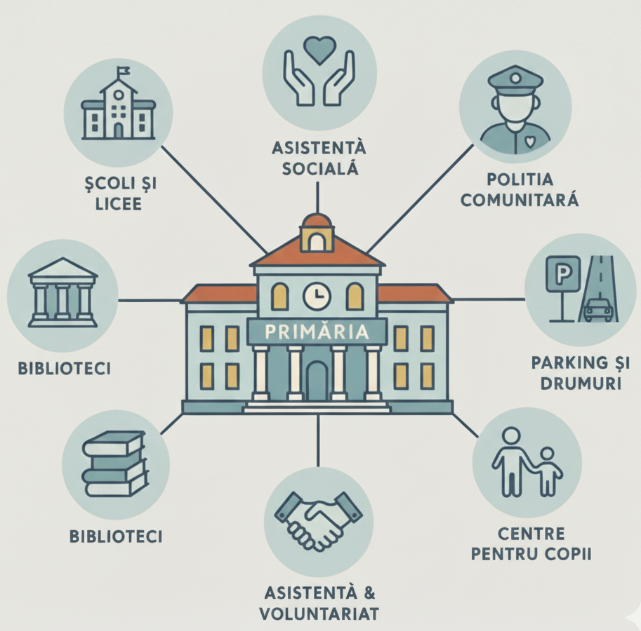 Primăria integrată și conectată la platforma My Town, toate instituțiile publice și serviciile subordonate, astfel încât să poată avea acces rapid, direct și simplu — totul la un click distanță. Iată doar câteva exemple: