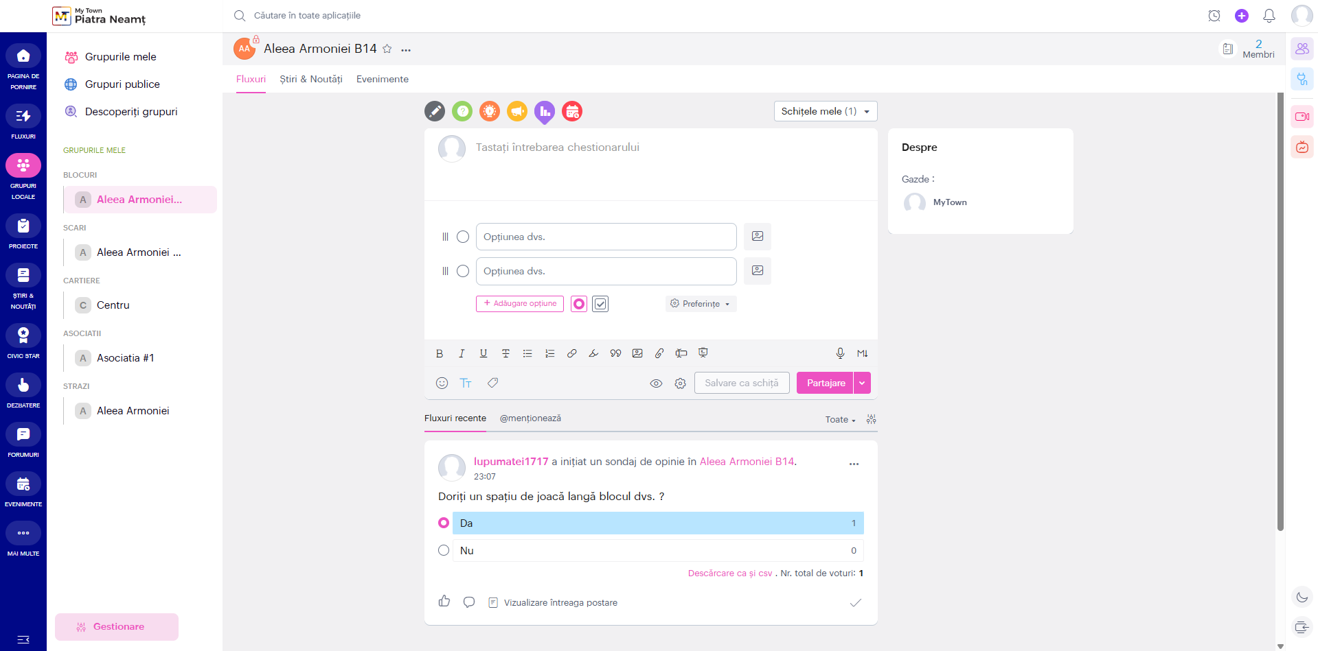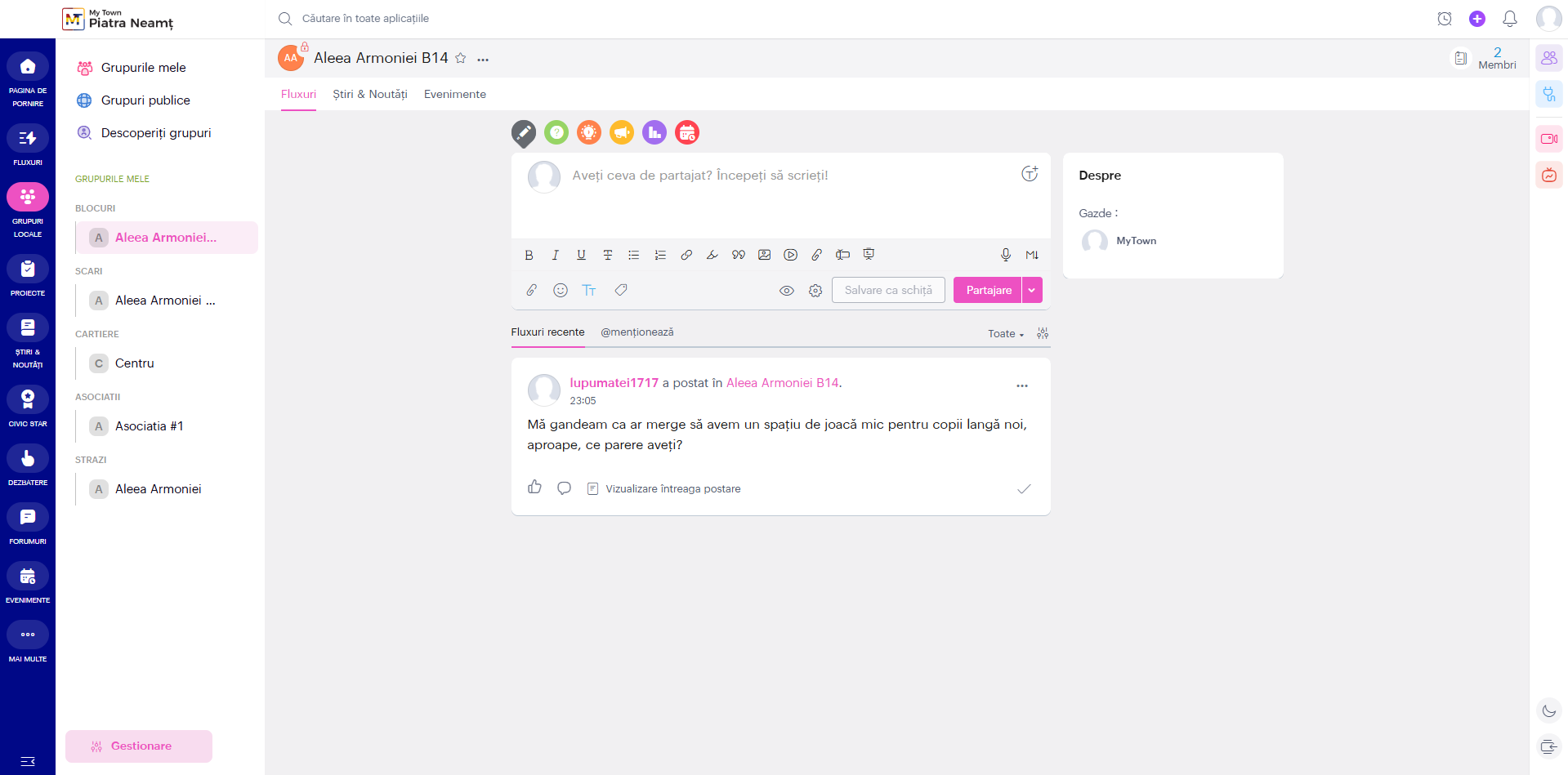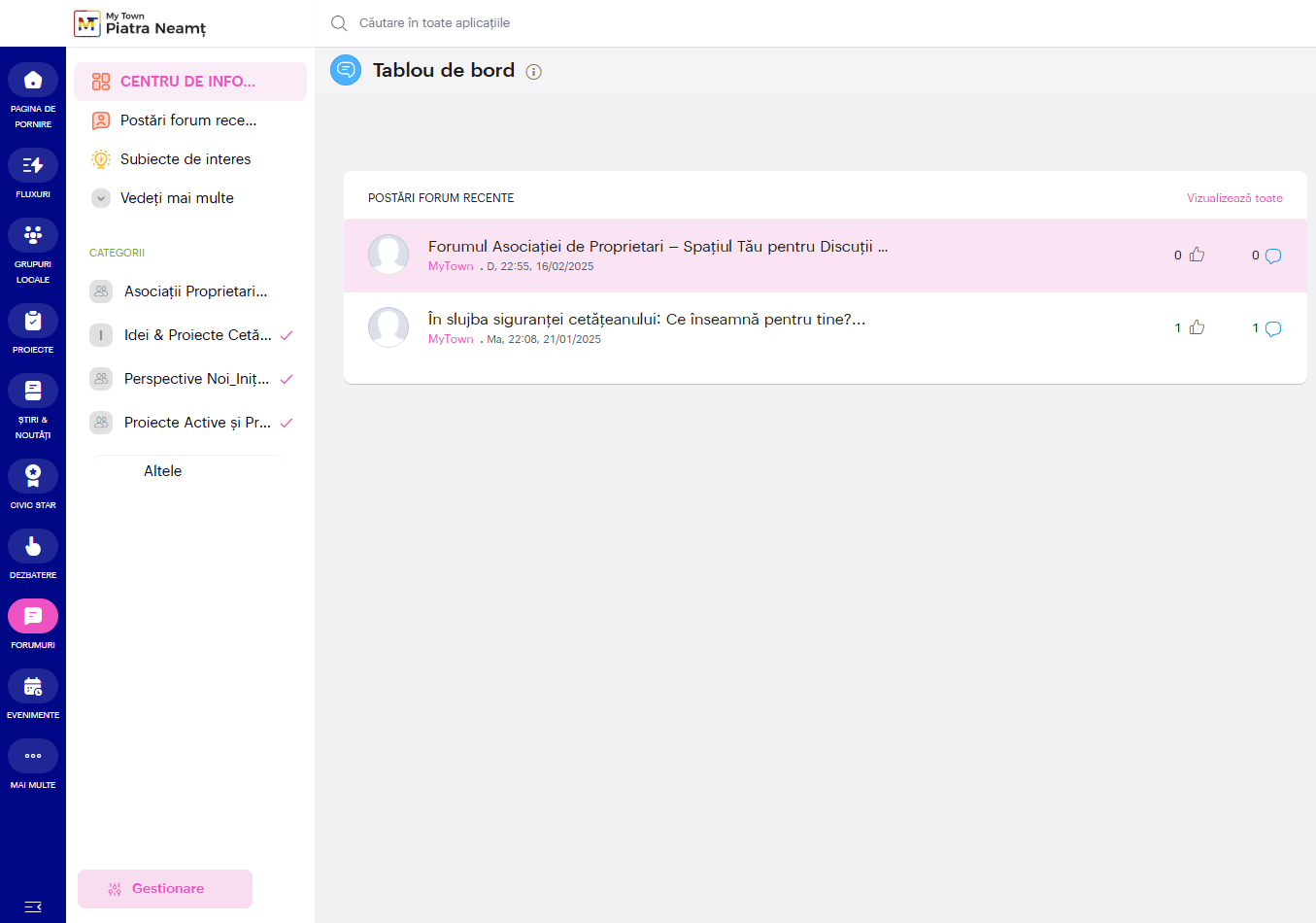 Există forumuri pe teme locale – de la siguranța în cartier la evenimente culturale. Poți comenta, lansa teme sau doar citi ce gândesc ceilalți.